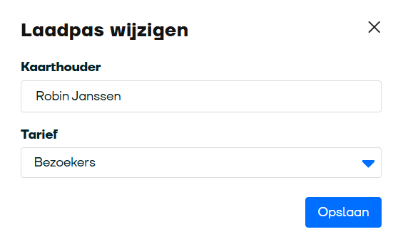 In het venster dat verschijnt selecteer je het gewenste tarief (bijven klik je op Opslaan. We gebruiken dit tarief om de laadkosten met deze laadpas te verrekenen.