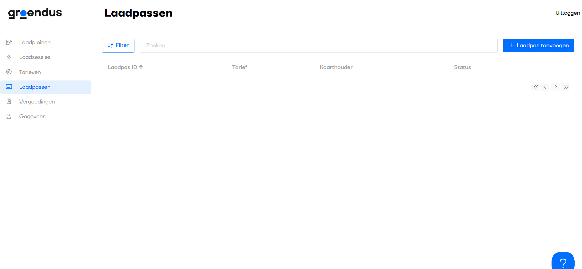 Log in op de Online Omgeving via laden.groendus.nl. Ga in het menu links naar Laadpassen. Je komt dan op onderstaande pagina.