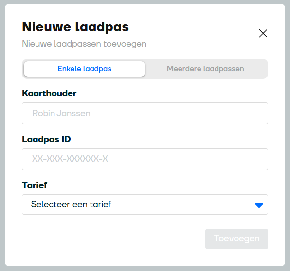 Om een laadpas toe te voegen heb je het laadpas ID en de naam van de kaarthouder nodig.