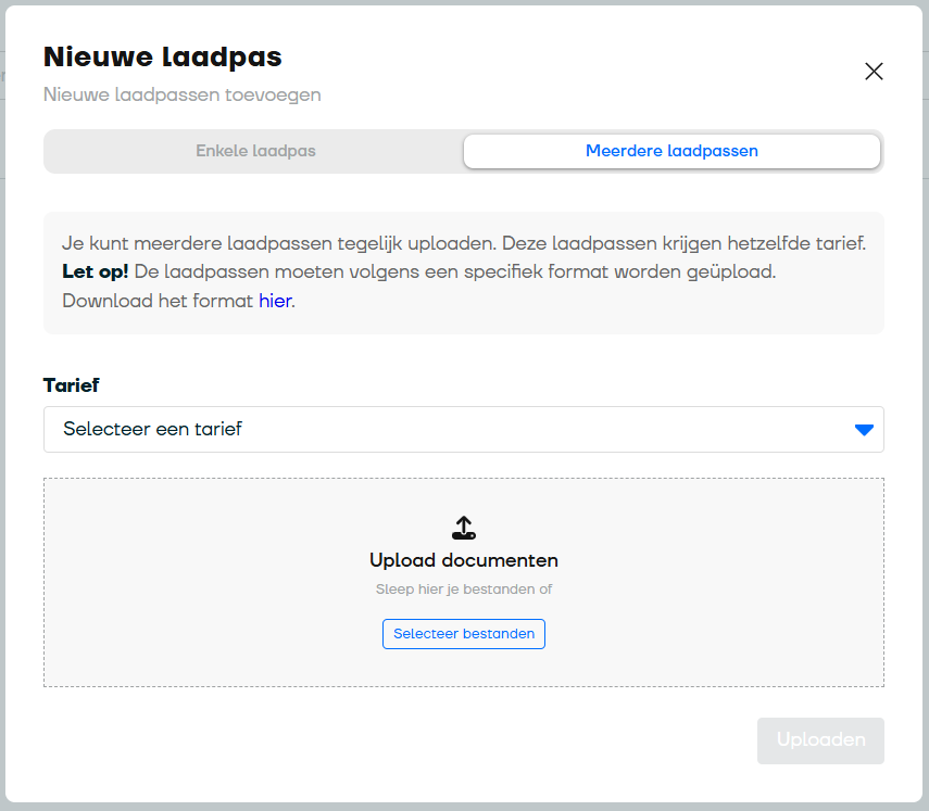 Hier kun je in één keer meerdere laadpassen toevoegen. Deze laadpassen krijgen hetzelfde tarief. Download de template hier en vul de gegevens in. Klik op opslaan en upload de template.